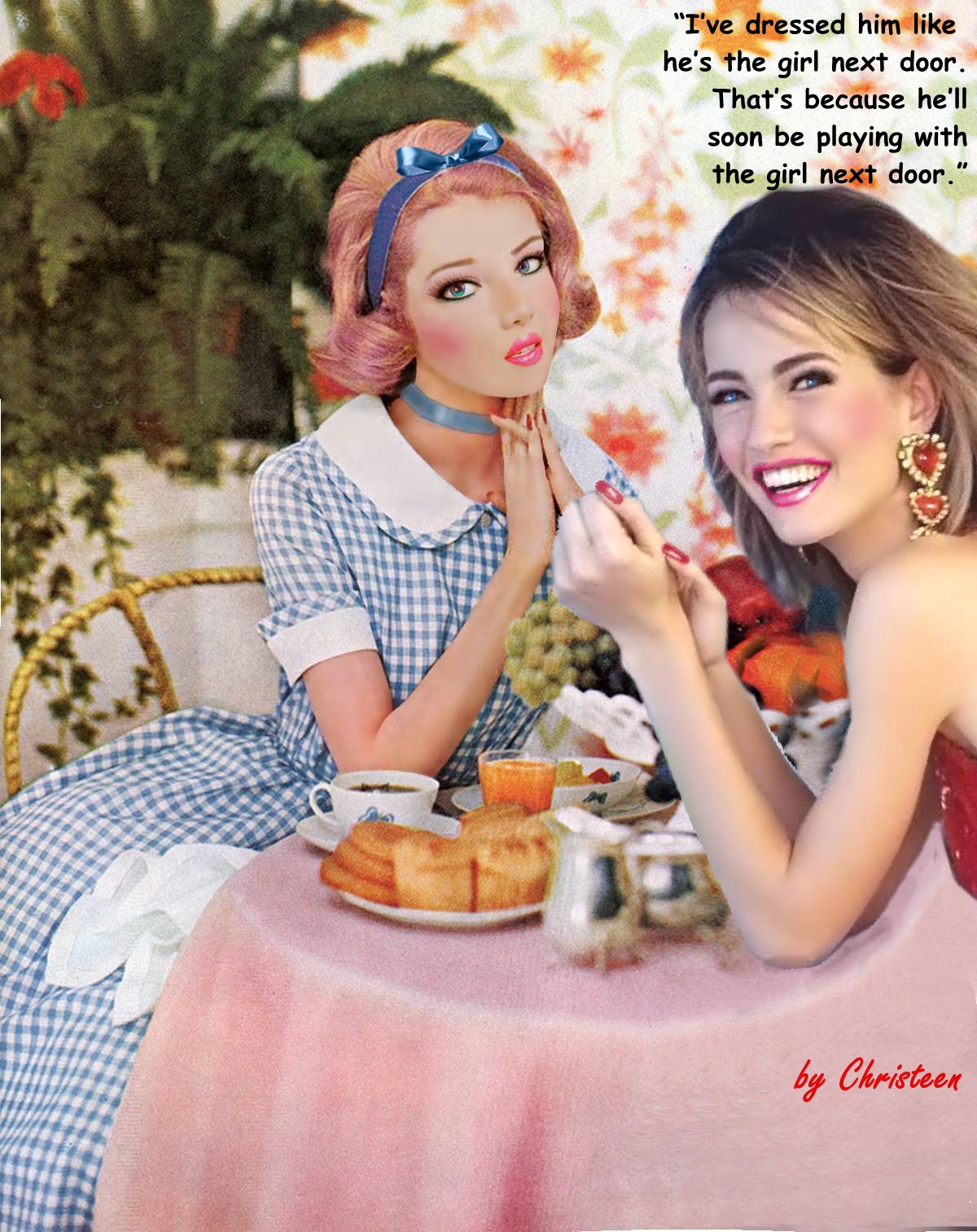 Oh, Christeen, I love Chris as the girl next door...he's soooo cute. I want to play with him, too. I like Chris pre-girls. At this stage of his transformation, he's not fully buying into his future as a sexy, lovely, desirable girl. He's so tenuous. You can tell he's thrilled with his gowns, makeup and femininity, but he's still enough of a boy to be slightly embarrassed. That will pass as we see from your lovely depictions of his later Level III self. He's absolutely adorable when the two matrons argue over future enhancements: I love the hairdo and the matching bow and gown...and the arm bracelet makes him simply scrumptious. Thank you so much for the lovely art and the great imaginative thoughts it produces.